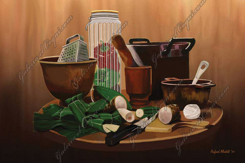 Anticipo Navideño captura la calidez y el espíritu de las tradiciones navideñas puertorriqueñas. Este bodegón reúne los utensilios e ingredientes esenciales para la preparación de pasteles—hojas de plátano, viandas, el guayo, pilón y caldero—cada uno cargado de memoria y tradición.